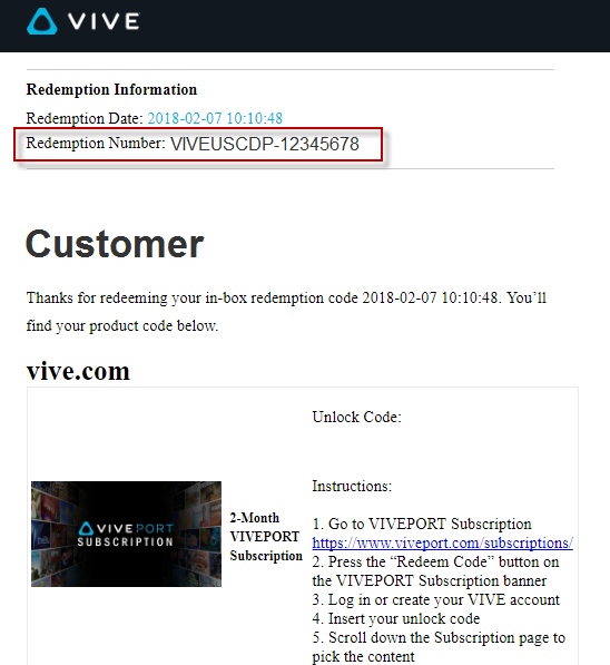 Please check the Vive Redemption - Redemption Confirmation email that has been sent to you and follow the activation instruction. If the issue persists, submit an inquiry form with the required information(Please follow the Q5 Answer) via the tab on the right of the redemption page.